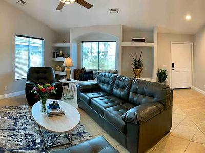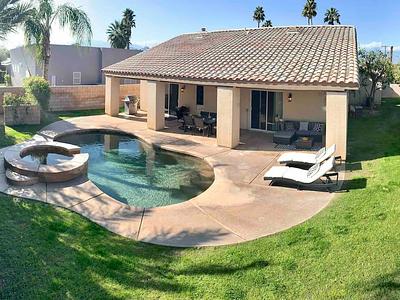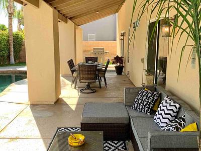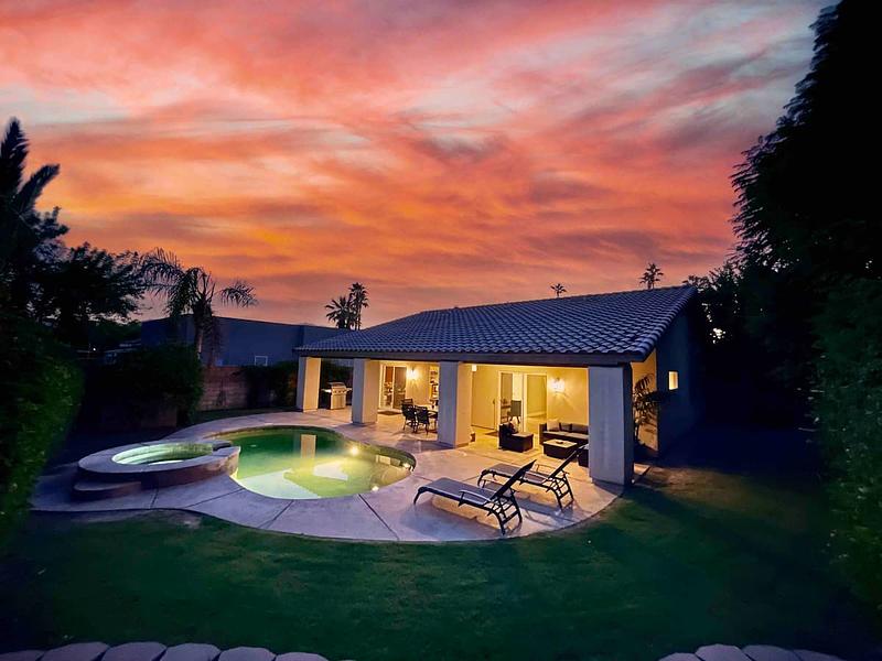 Open High Ceilings LUXURIOUS home close to Coachella, Stagecoach, Golf, Tennis, Dining, Indian Wells Tennis Garden, Eldorado Polo Club, Spotlight 29 & walking distance to Bermuda Dunes Executive Airport. Close to shuttles to all the music festivals. Free Level 2 EV Charger. PRIVATE Peaceful & Tranquil resort style backyard with heated Saltwater Spa Pool, & fruit trees. Master has Cal King bed, 1 Guest room has Queen bed, 1 Guest room has Full bed & Adult style bunks, & living room pullout sofa. Open floor plan, 1,875 sq. ft. vacation home with High Ceilings.