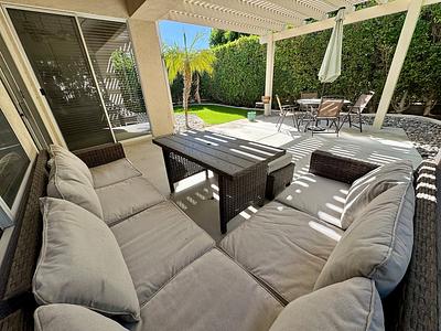 Calm, stylish retreat in the prestigious Heritage Palms Golf Community, an active 55+ neighborhood in Indio, California. Perfect for seasonal stays, golf getaways, or peaceful desert living. Private backyard, new flooring throughout, granite kitchen countertops, dual master vanity sinks with a separate tub and shower, ceiling fans, a laundry room, and a 2 car garage.